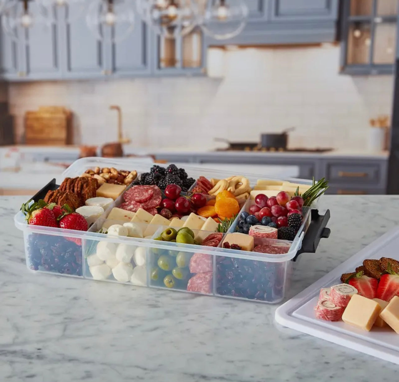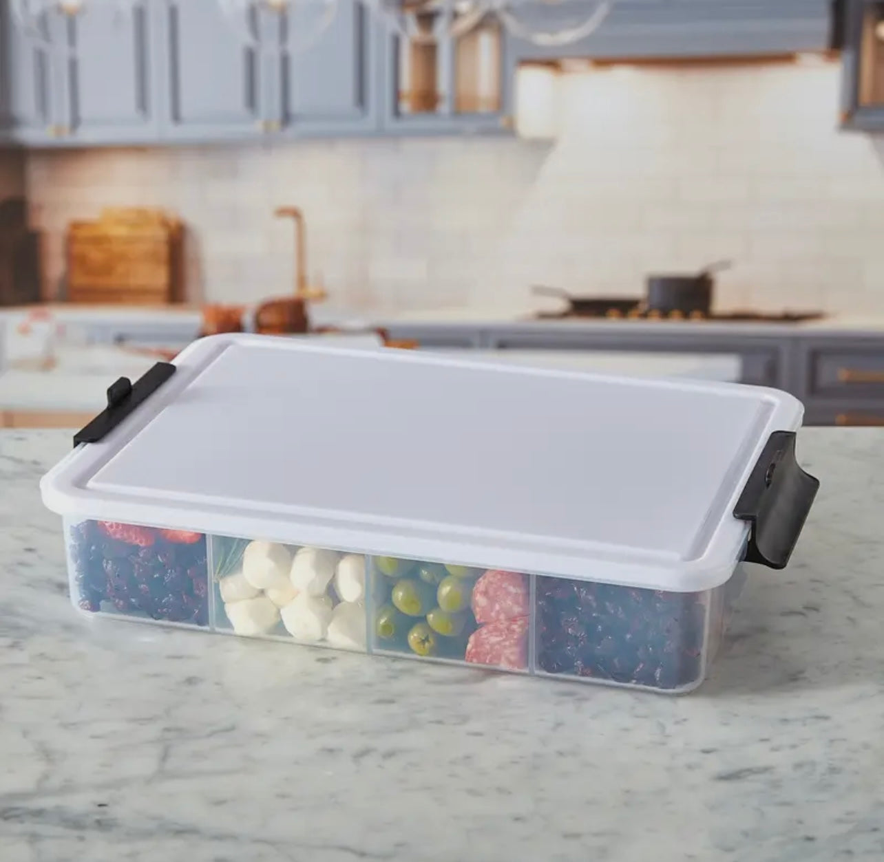 Introducing the 11x16 Snacklebox- the ultimate on-the-go snacking solution! With its dual function lid doubles as a cutting board, making snacking effortless. With 11 organized compartments, you'll never struggle to find your favorite treat again! Simplify your snacking experience with the Snacklebox.