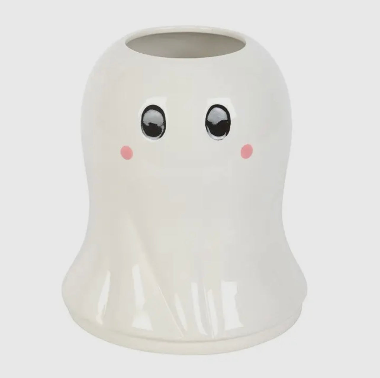 Add a touch of spooky cuteness to your home decor with our Ghost Ceramic Vase. This adorable vase features a playful ghost design that will bring a smile to your face every time you see it. Fill with your favorite foliage and watch it come to life! Vase only, foliage not included