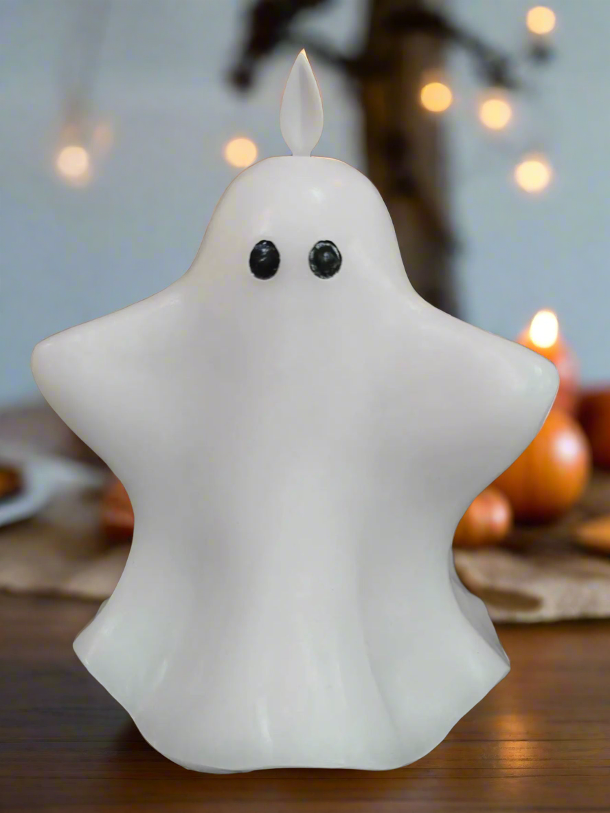 Set the mood and minimize risk with this Ghost LED Candle! Its timer function and battery-powered design make it a convenient and foolproof way to add the perfect ambiance to your space. Standing at 4.6 x 5.3", it's easy to place anywhere for a daring touch of light. AA batteries not included
