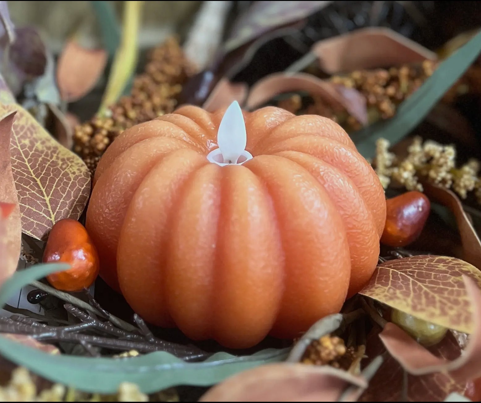 Bringing the cozy feel of a pumpkin patch to your home has never been so easy (or fun)! This vibrant orange candle, complete with a lifelike moving flame, runs on AA batteries (not included). Includes remote control
