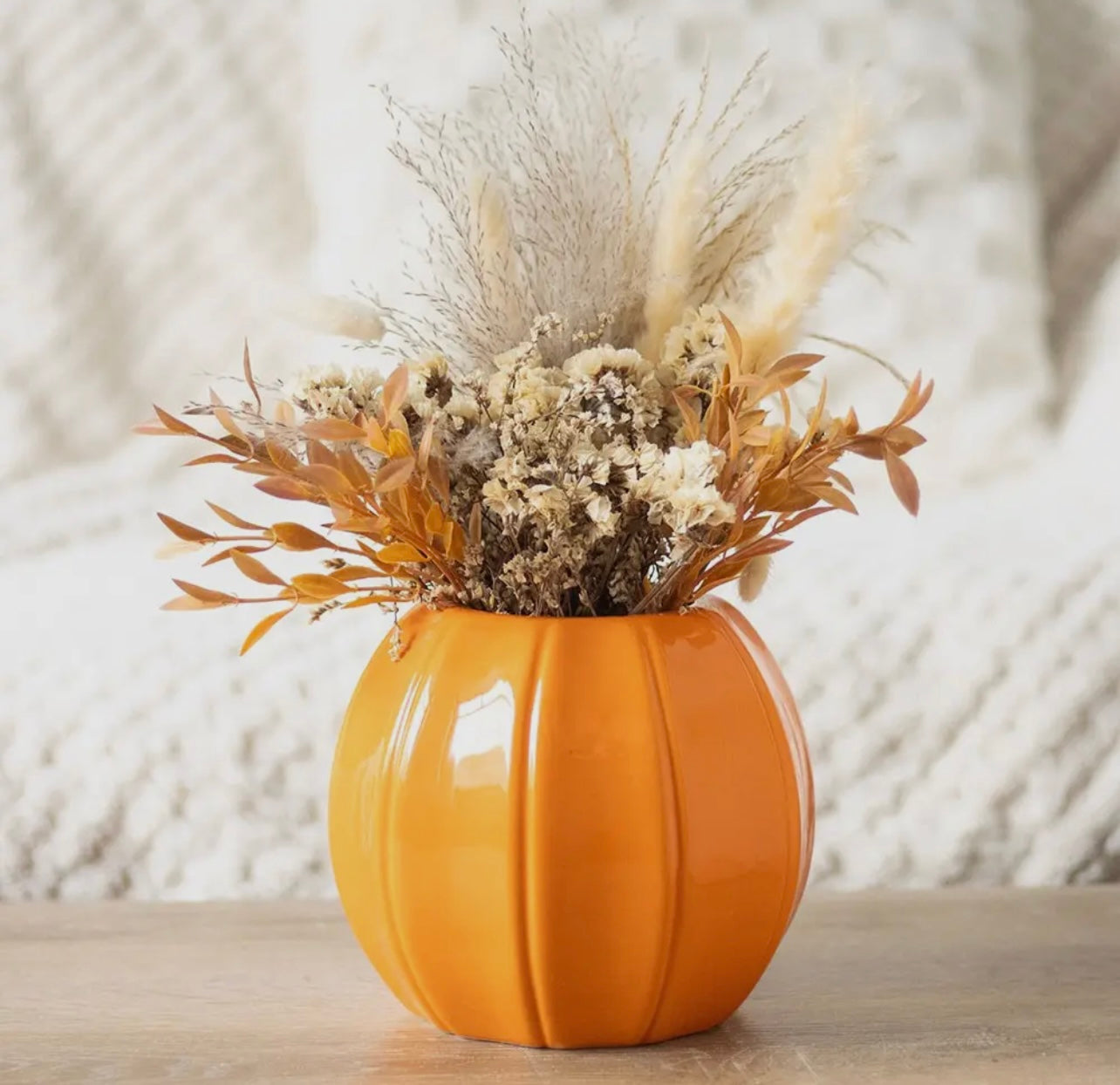 Add a touch of autumn charm to your home decor with our Pumpkin Ceramic Vase! The vibrant orange color and unique pumpkin shape make it a statement piece on its own or filled with fall foliage. Made of durable ceramic, this vase is a must-have for any seasonal display.