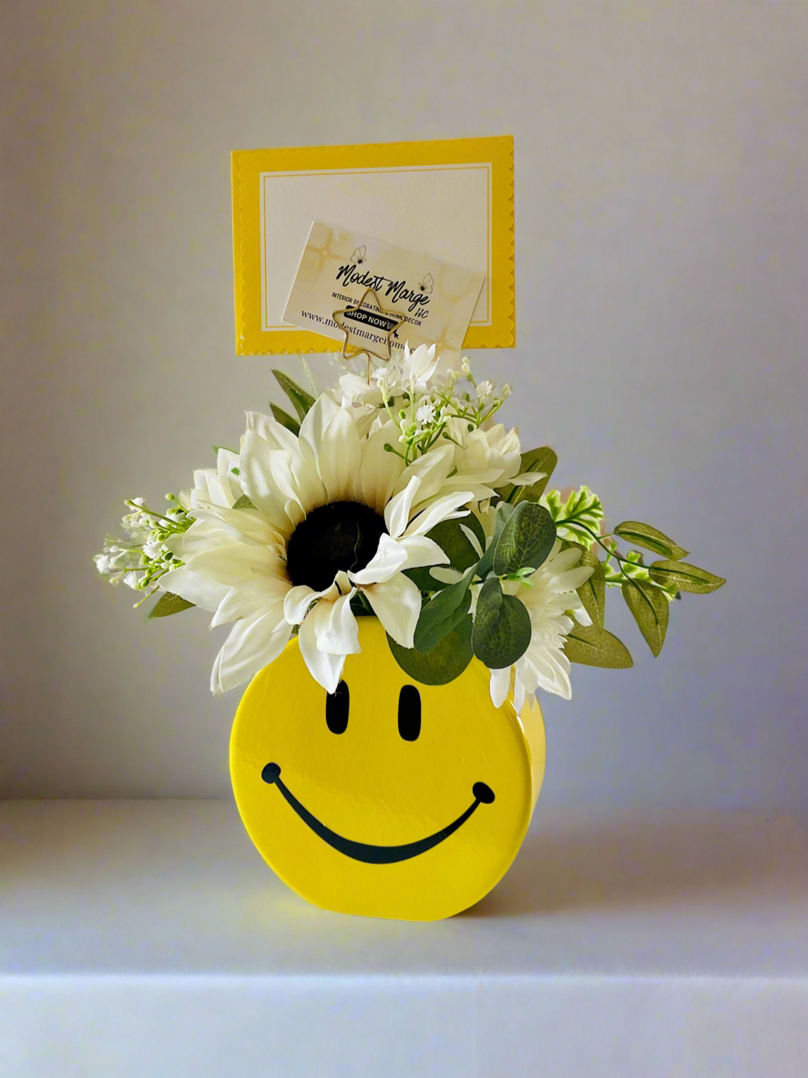 Add a pop of joy to any space with this Smiley Face Planter and Floral Arrangement! Featuring a bundle of bright, cheery faux sunflowers and a matching card, this planter is sure to bring a smile to anyone's face. Plus, no need to worry about wilting - these flowers will last forever. For an extra special touch, add a gift card and we'll even wrap it for you. Perfect for gifting to yourself or a loved one!