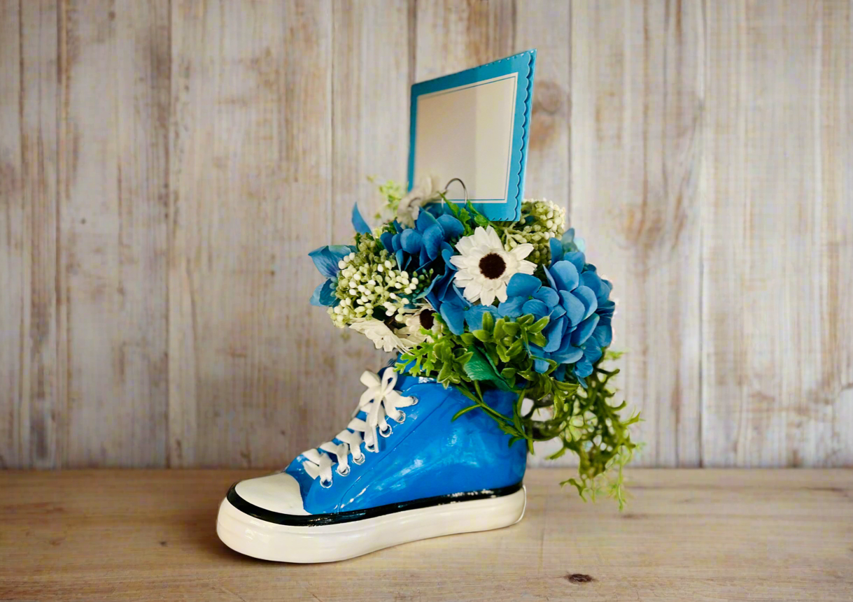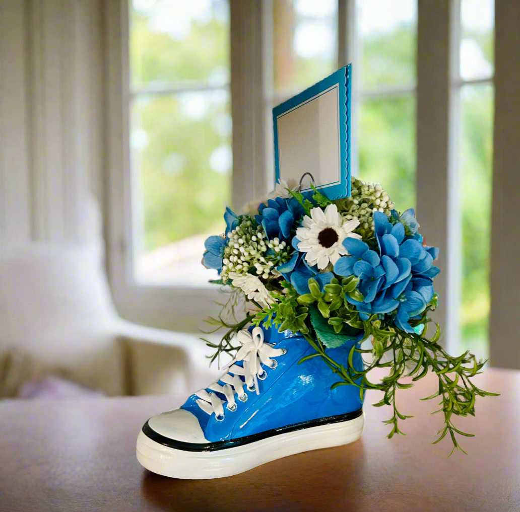 Brighten up someone's day with this fun and quirky Sneaker Planter with Floral Arrangement! Handmade faux bouquet, this unique floral arrangement comes in a fun sneaker vase. Perfect for birthdays, congratulations, or just because. Includes a removable card and card holder for an extra personal touch.